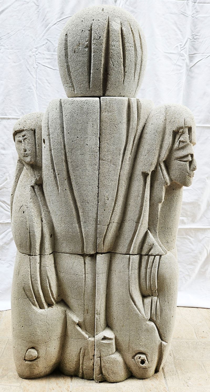 Carved in stone, the work reveals flowing human forms that merge with wave-like curves, symbolizing the sea’s power to shape memory, identity, and imagination.
