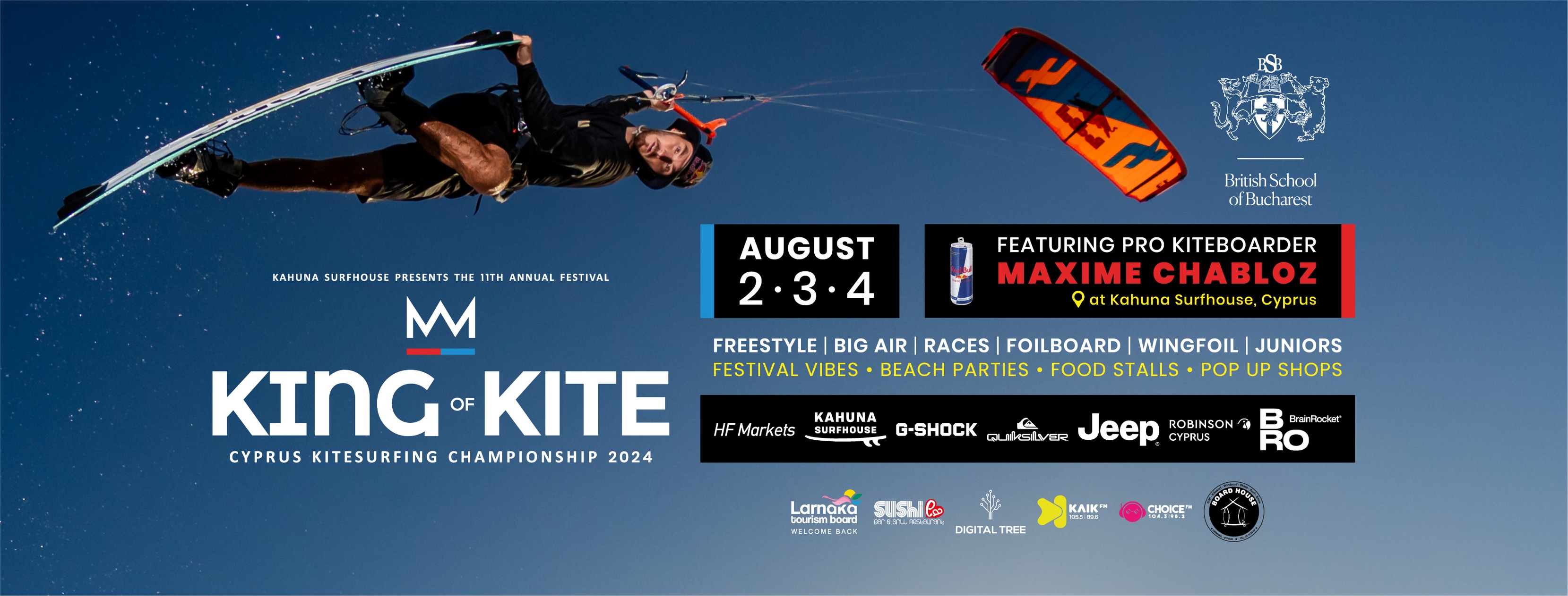 Kahuna Surfhouse presents the 11th annual festival & Cyprus Kitesurfing Championship 2024, 'King of Kite' at Kahuna Surfhouse featuring pro kite boarder Maxim Chabloz