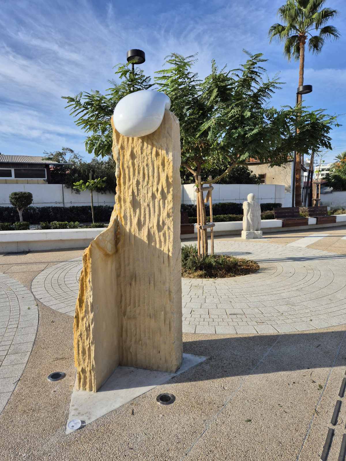 The fluid object in the work symbolizes the thymic, which is the part of the soul that encompasses emotion and volition; it is also a symbol of childlikeness and freedom. The stone, as a foundation, symbolizes support and the framework that, with a discreet and permissive character, frames and steadfastly supports. It is a reference to the inhabitants who embrace the Mediterranean as a place of action, thus seeking an unknown, new journey.